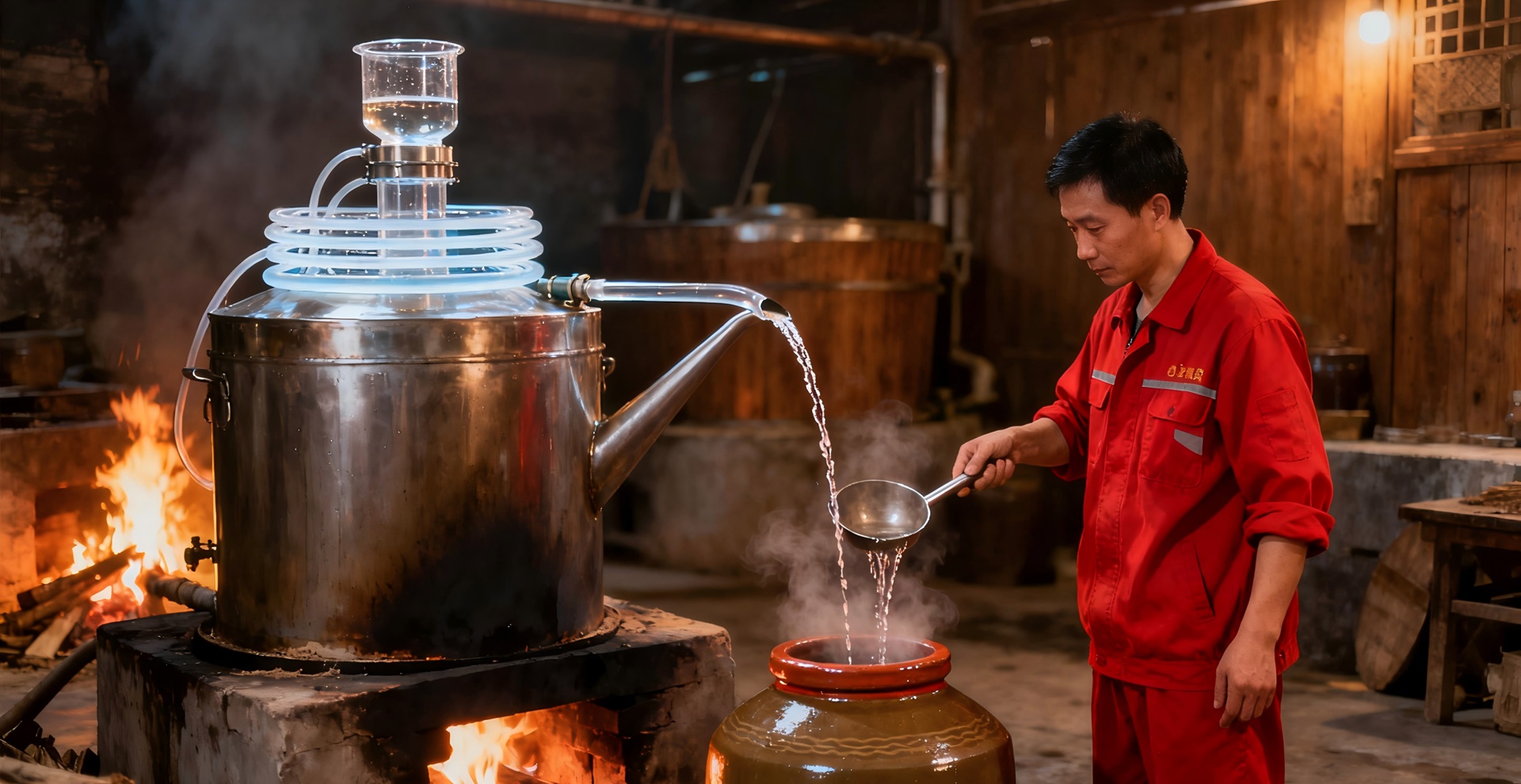 发酵好的酒醅装入蒸馏器,通过加热蒸馏出无色透明的基酒,酒液缓缓流入容器。