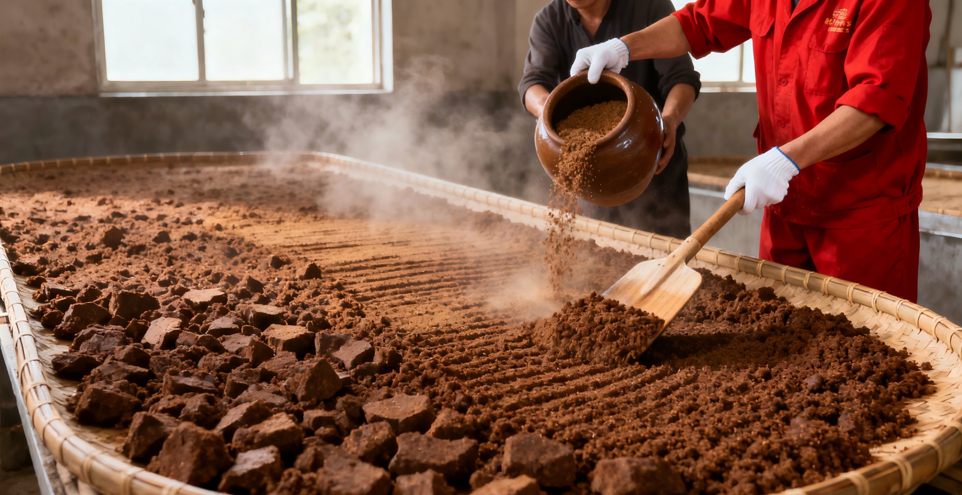 蒸煮后的原料倾倒在竹制晾床上摊开降温,工人均匀撒入酒曲并翻拌。