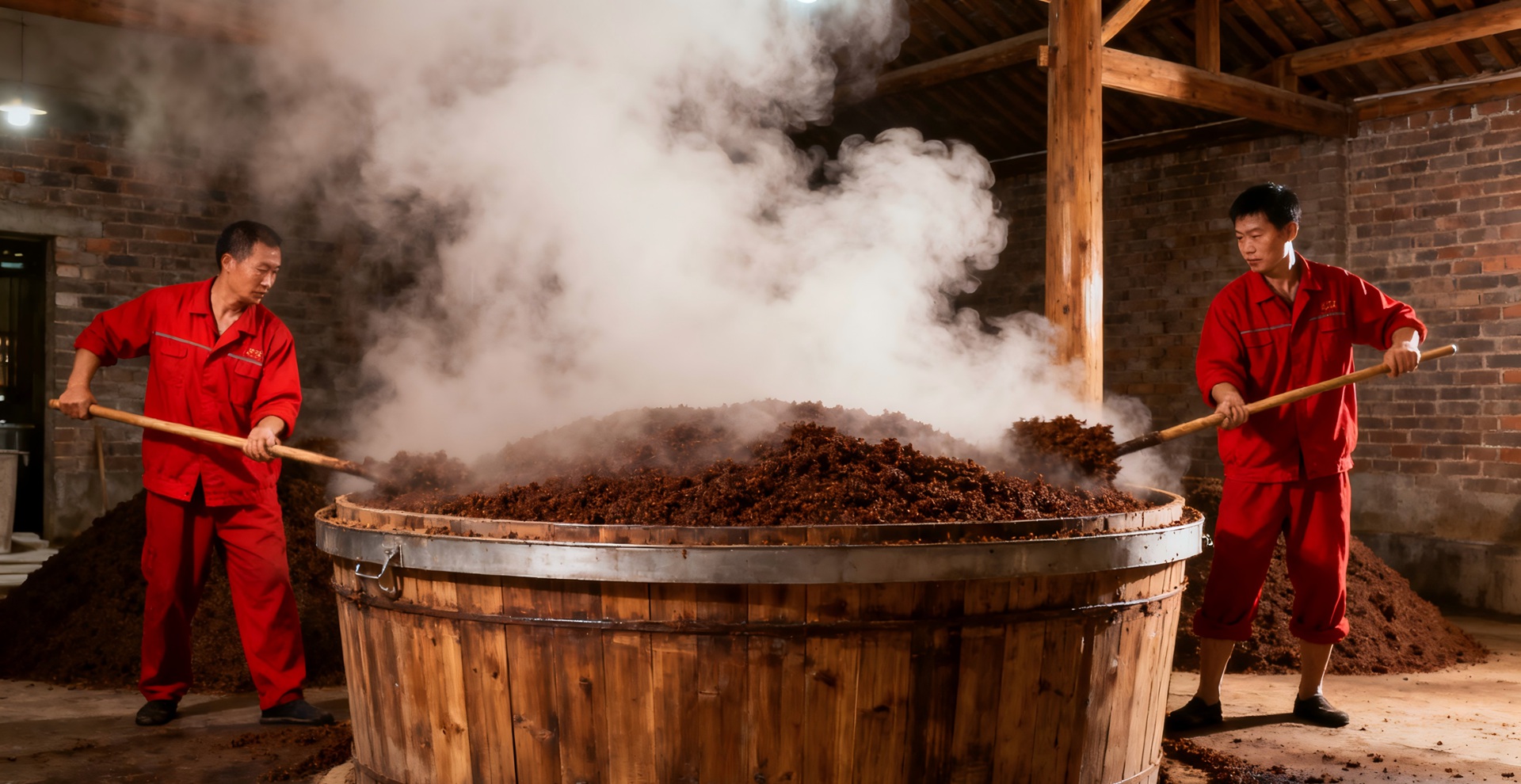将清洗后的原料放入巨大的木甑中,用蒸汽高温蒸煮至熟透,冒出白色蒸汽。