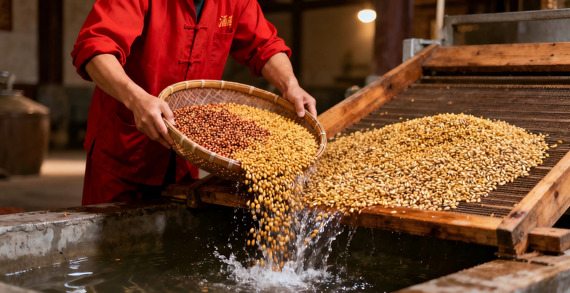 工人仔细挑选颗粒饱满的高粱、小麦等原料,去除杂质后用清水冲洗。